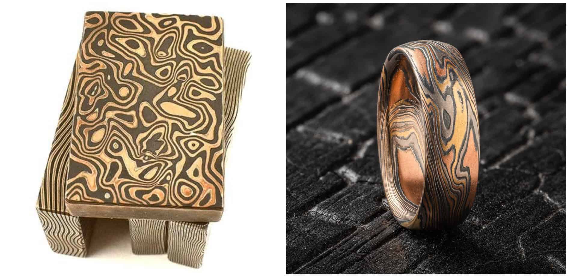 Meanwhile, Mokume Gane (木目金; “Wood Eye Metal”) is a metalworking technique derived from Japan. Unlike Damascus, Mokume Gane uses a wider range of metals – usually softer and non-ferrous metals (or precious metals) like brass, gold, platinum, silver, etc. With high pressure and temperature, Mokume Gane also makes woodgrain-like patterns. While Damascus is often used for weapons and tools, the application of Mokume Gane tilts towards jewelry and artworks due to its softer nature.
