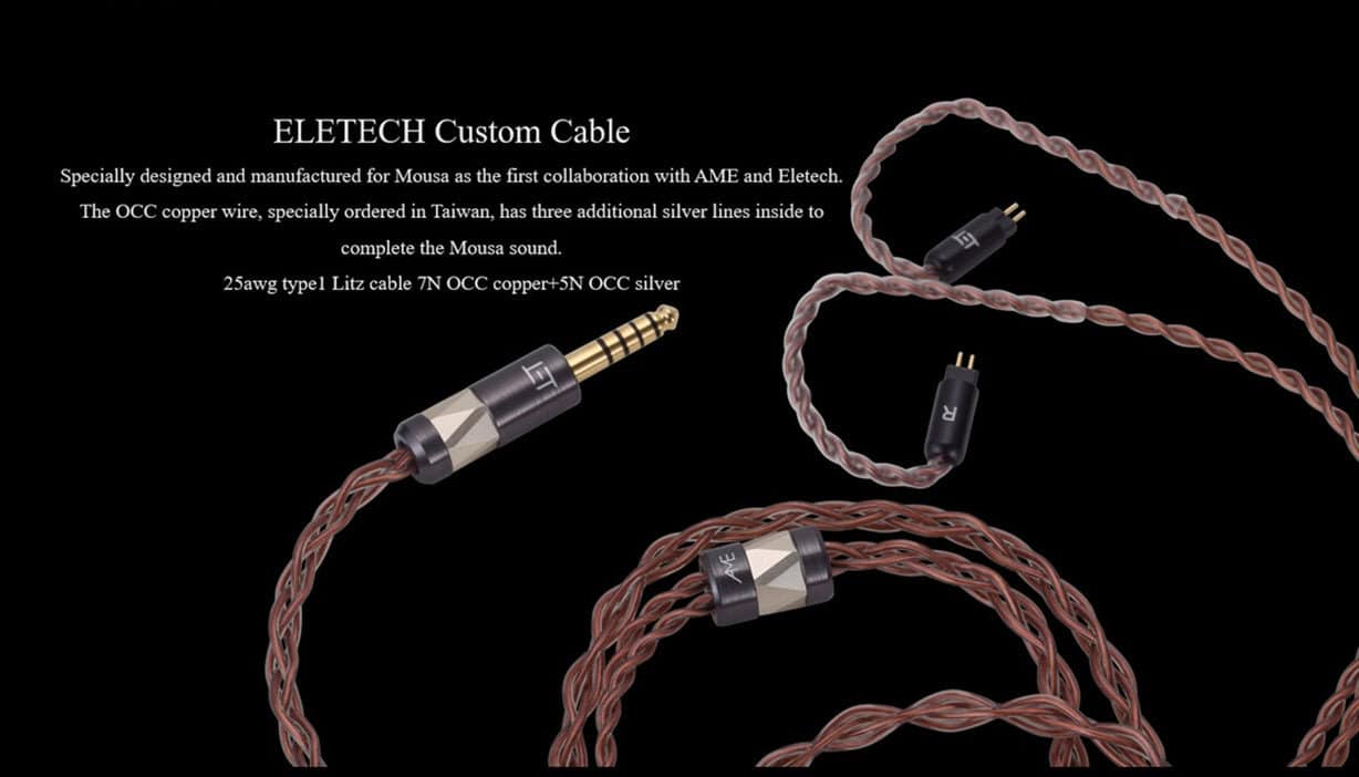 For Mousa’s stock cable, AME held hands with Eletech, a popular and familiar custom cable brand. While it doesn’t have a designated name for it (which I still wonder), this Eletech cable uses a Copper+Silver blend of Taiwanese wires. Custom-built OCC wires and three internal pure silver wires were chosen to pair with the sound of Mousa. Detailed specs are 25AWG Type 1 Litz, 7N OCC Copper with 5N Silver. The Mousa stock cable has a similar form factor to other Eletech cables – light, soft, and easy to handle.