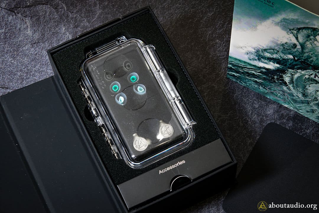 The word “Volans” refers to a constellation shape of a flying fish, hence the splashing sea graphics on the outer package and the silvery fish symbol at the bottom. Other than the earphones, Volans MK2 comes with 3 pairs of silicone tips, a pair of foam tips, a cleaning tool, a pair of earpiece mesh bags, a cleaning tool, paperwork, and a hard case. The earpieces are very soft and elastic, offering a comfy fit.