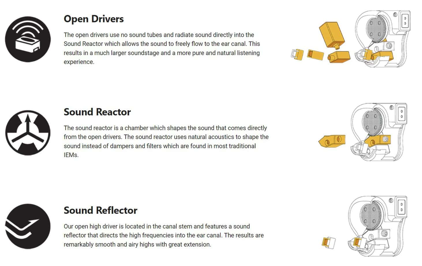 Lastly, the Open Acoustics system. It’s basically FIR’s “Open Driver” BAs that offer better performance for the higher frequencies. A similar example would be 64 Audio’s Tia™ Drivers. FIR’s Open Drivers are applied for all of Xenon 6’s drivers – except the dynamic driver. But then again, the dynamic driver is also fully vented and positioned as near and parallel as possible to the ears, so I suppose all of Xenon 6’s drivers are vented in their ways.