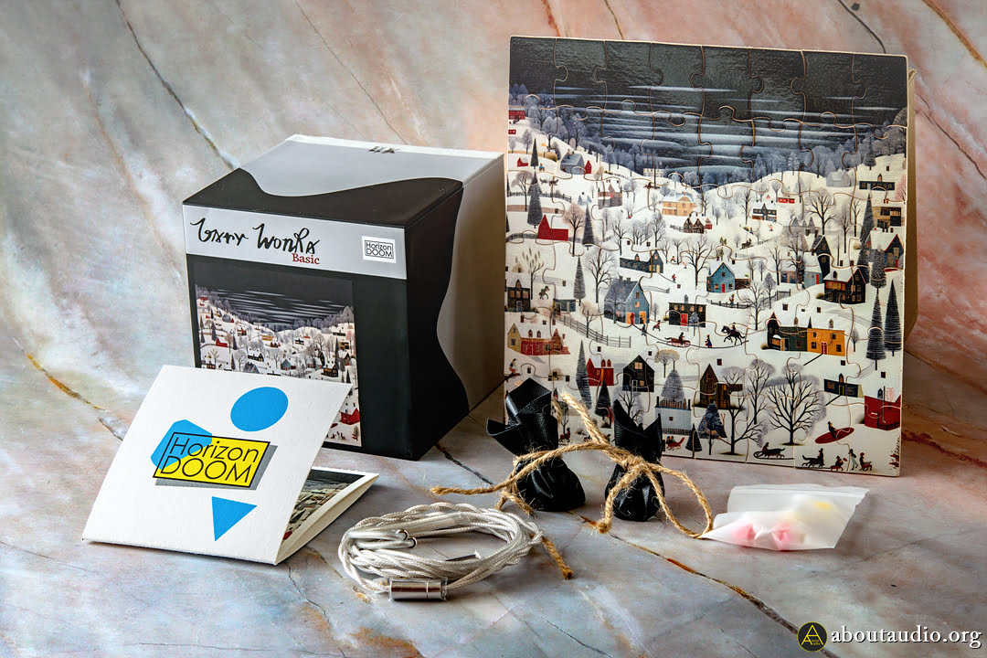 Starting with the packaging, Horizon Doom took an interesting approach by teaming up with Gary & Wonka Art Studio from Spain to create paint art for Basic. The Basic IEMs come in a wood case with an outer box beautifully designed with the paint art. Once opened, Basic welcomes you with cards and paperwork. The earpieces are wrapped in leather pieces and with ropes.