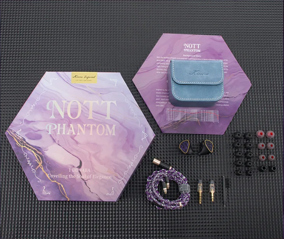 Kinera Nott Phantom is a 5-driver hybrid IEM with a 1DD+4BA setup. While the DD+BA combination may seem common as it could get, Nott Phantom is applied with a variety of acoustic features and tuning procedures. The 8mm polymer fiber DD is topped with a strong N52 magnet for strong yet precise bass response, while 4 custom BA drivers cover the mids and highs – each of two sourced from Sonion and Knowles.