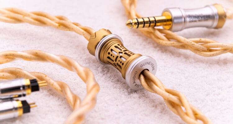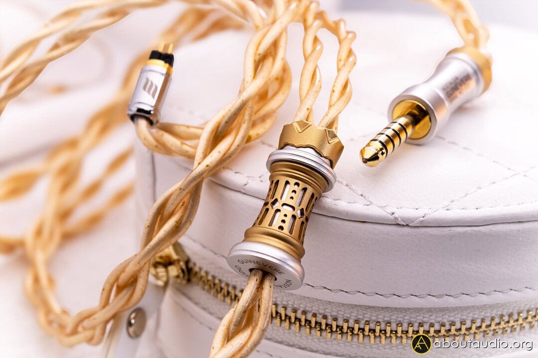 Guinevere is terminated with 4 braids of champagne-gold-toned wires, spread with golden flakes. The wires are thicker than average cables but not cumbersome, so they still feel very convenient for portable use. It’s also slightly weightier than average cables, but still within the comfortable range for flagship cables. Guinevere is soft, pliable, and does not cause microphonics.