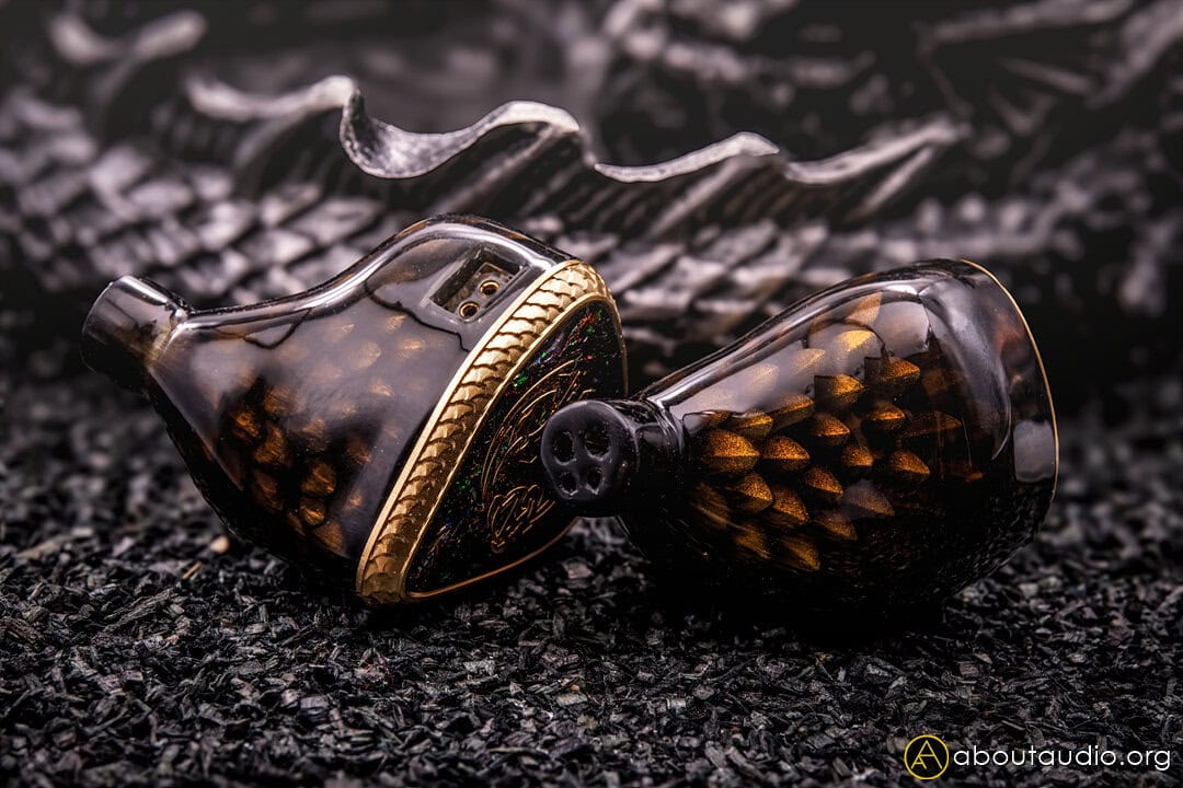 Pendragon’s faceplates are built around a layered carbon fiber design, patterned to resemble dragon scales. The shimmer is subtle yet gives off a very premium look without getting flashy, showing different hues depending on the angle of light. Pendragon is also topped with a gold dragonscale rim, finely machined with CNC for achieving a smooth surface and in-depth details. The faceplates feature ‘The King’s Treasure Vault’, which is a multi-color, fragmented, carbon fiber panel. The PD (short for Pendragon) shells are on the thicker side than standard IEMs, yet the inner body is smoothly contoured and ergonomic, so the fit feels natural once worn. Great design that nods to the dragon theme without overcomplicating things.