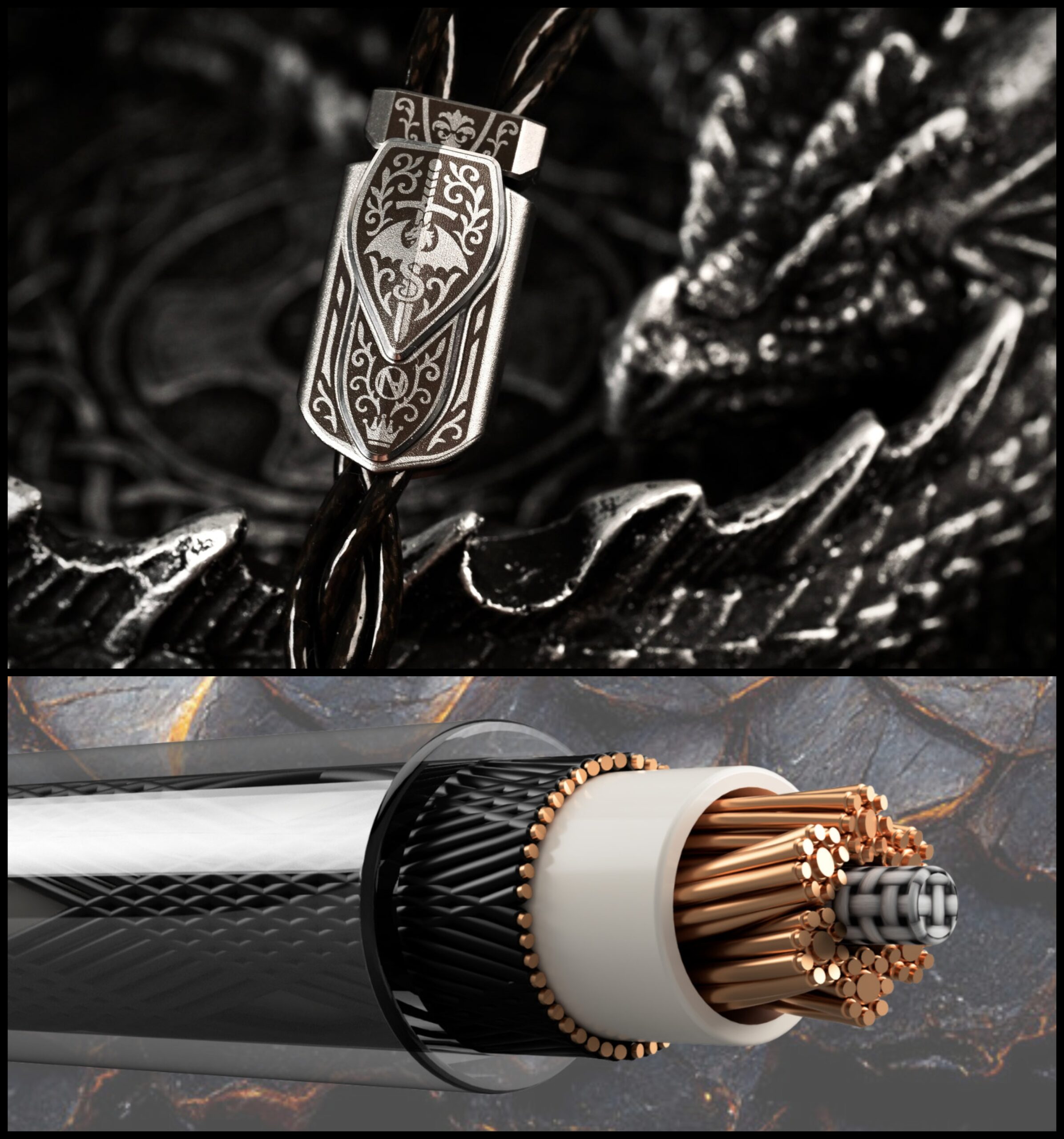 Pendragon comes bundled with an exclusive, flagship-tier stock cable named the Caliburn, designed exclusively for this model. Unlike Durandal, Nostalgia Audio’s collaborative project with Vortex Cables, Caliburn is tuned solely by the Nostalgia team themselves, and specifically for the goal of complementing Pendragon’s performance and desired sound signature. Visually, the cable adopts a black and gray dual-tone finish with subtle texturing that ties in with Pendragon’s dragon-scale motif. The cables are terminated in 2pin-4.4mm connectors.