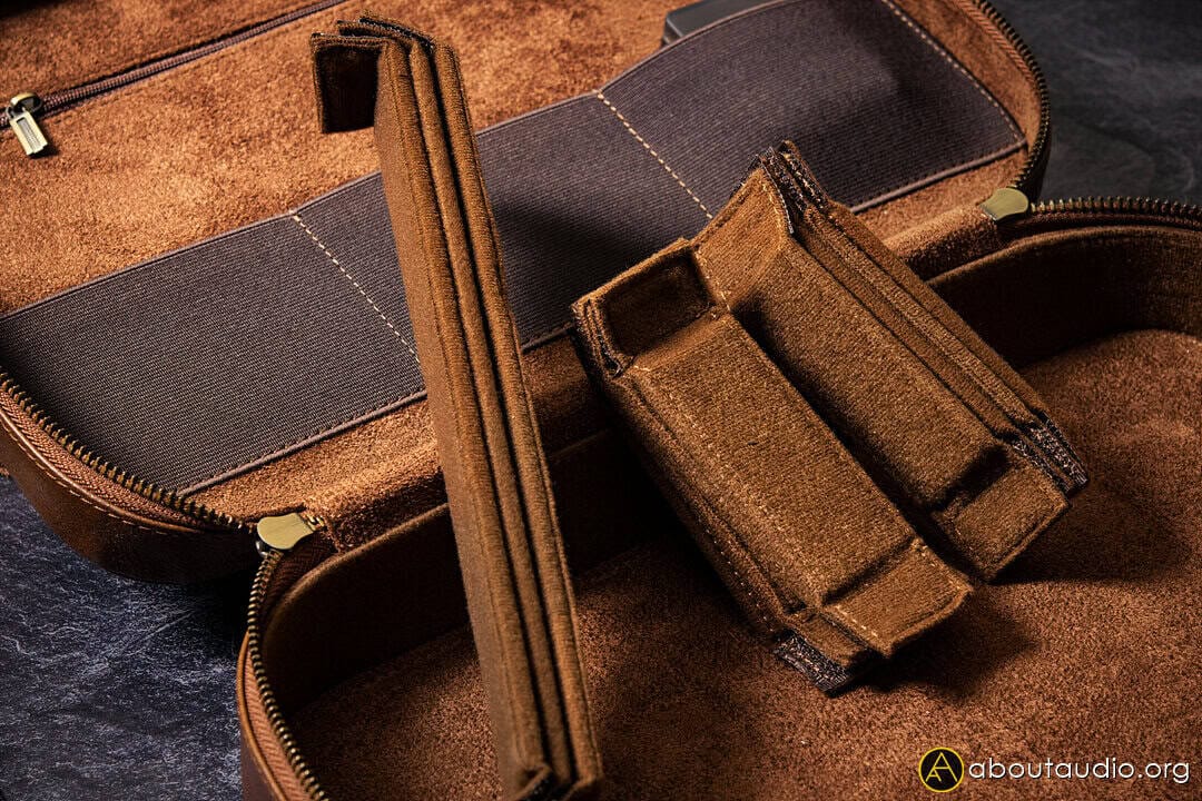 The leather case has a built-in divider that divides the cables from the earpieces, as well as dividing the right earpieces from the left one, making the earphones completely worry-free from rattling around. The inner side of the leather case is also finished with a soft, cushioned material. The inner side of the lid also includes a small pouch area for including additional accessories. Speaking of additional accessories, this is where the leather cable tie and spare modular plugs could be found.