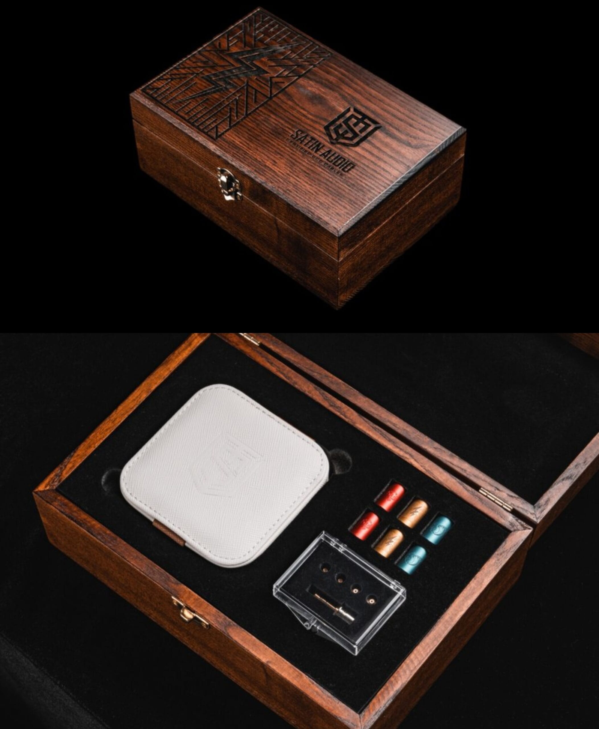Satin Audio has evolved with their packaging presentation since the release of OG Zeus. Zeus II comes in with a nice wooden box with an artfully engraved design on the lid. Other than the cable itself, Zeus II comes with a premium SA genuine leather case, 4 pairs of switchable metal connector sleeves, 3 pairs of interchangeable IEM connectors, 2 sets of interchangeable plugs, and a leather cable tie. The interchangeable plugs and connectors are packed in a neat plastic container for convenient storage.