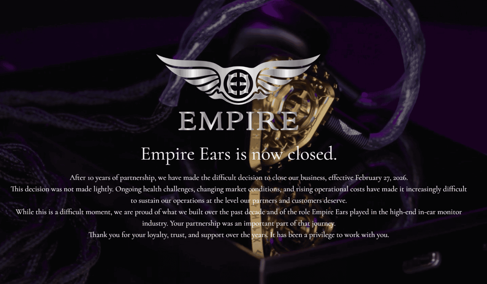 Ultimately, however, the Odin MKII became the final chapter for Empire Ears. On February 28th, 2026, Empire Ears abruptly shut down its operations. All of the company’s website pages were taken offline and redirected to a single statement on the front page as follows.