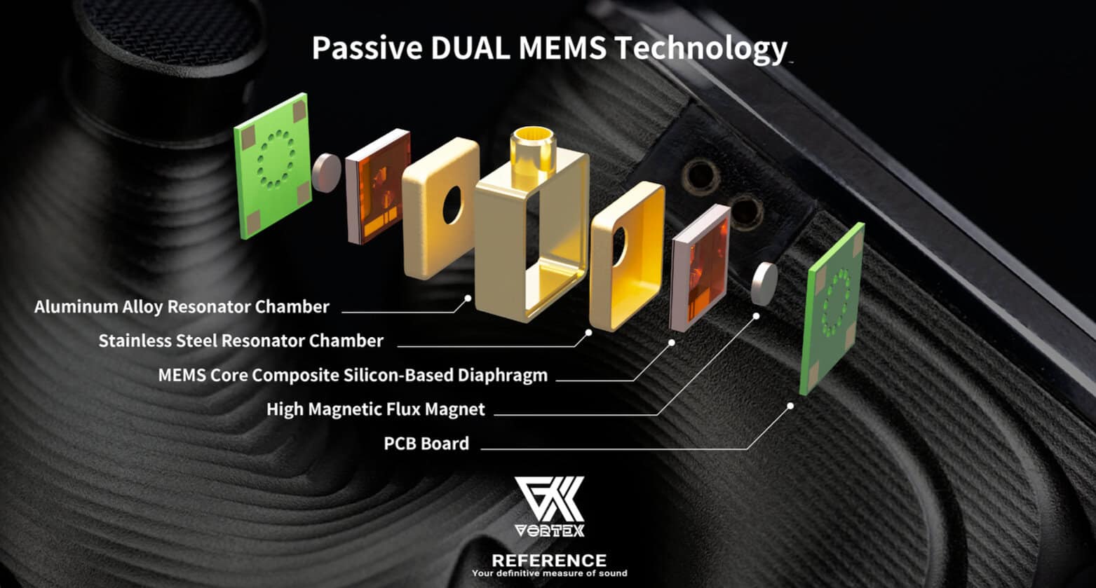 The driver configuration of Vortex Reference is 2DD+2 Passive MEMS. The dynamic drivers are divided by role: an 8mm aluminum-magnesium alloy dome woofer for the bass and a 6.5mm three-layer composite titanium-plated driver for the midrange. The highs are handled by Vortex’s passive dual MEMS tweeter system, which is the world’s first in the IEM industry. MEMS drivers carry well-documented advantages in speed, distortion control, and high-frequency extension.